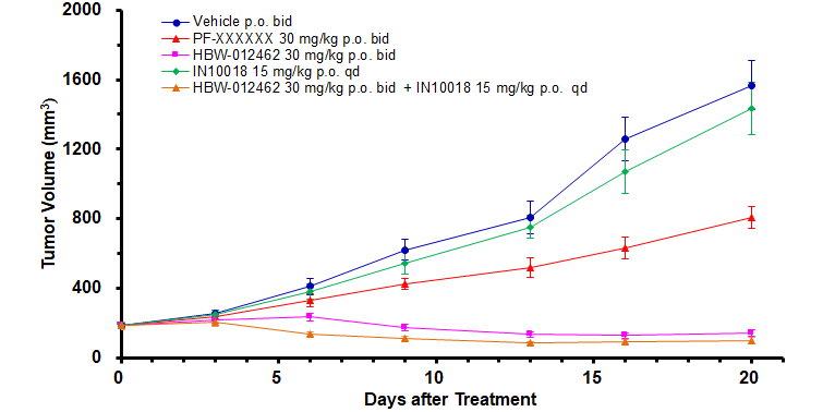 4)药物联用协同作用强。HBW-012462与FAK、EGFR等小分子或单抗药物联用能完全抑制肿瘤生长甚至使肿瘤明显消退,显示出明确的联用效果。