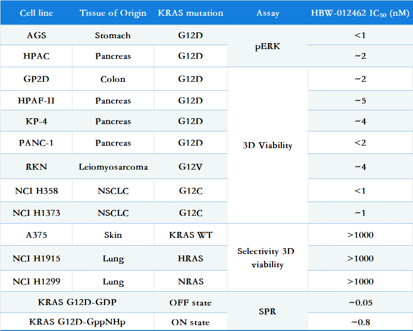 1)活性强选择性高。HBW-012462对GP2D(人结肠癌细胞)、RKN(人卵巢癌细胞)、PANC-1(人胰腺上皮样癌细胞)以及NCI-H1373(人肺腺癌细胞)等多种KRAS突变的细胞增殖均具有强抑制活性,且对HRAS、NRAS和KRAS WT没有抑制作用。