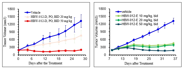 抗肿瘤效果优异:多个体内药效相关的动物模型研究显示,在口服给药10mg/kg条件下,HBW-012-D、HBW-012-E就能有效抑制肿瘤生长;高剂量条件下,能使肿瘤明显消退,并体现出相对明确的剂量依赖关系。另外相关PK/PD研究显示,肿瘤组织中的药物浓度高于血浆中的药物浓度近10倍左右,具有显著的肿瘤组织靶向性。