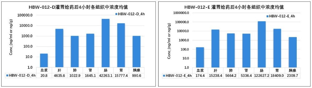 组织靶向性明确:大鼠及犬的组织分布研究显示,HBW-012-D、HBW-012-E在实验动物的胰腺、结直肠及肺等组织靶器官中的药物浓度高于血浆中的药物浓度十多倍乃至数十倍,组织靶向性十分明确。